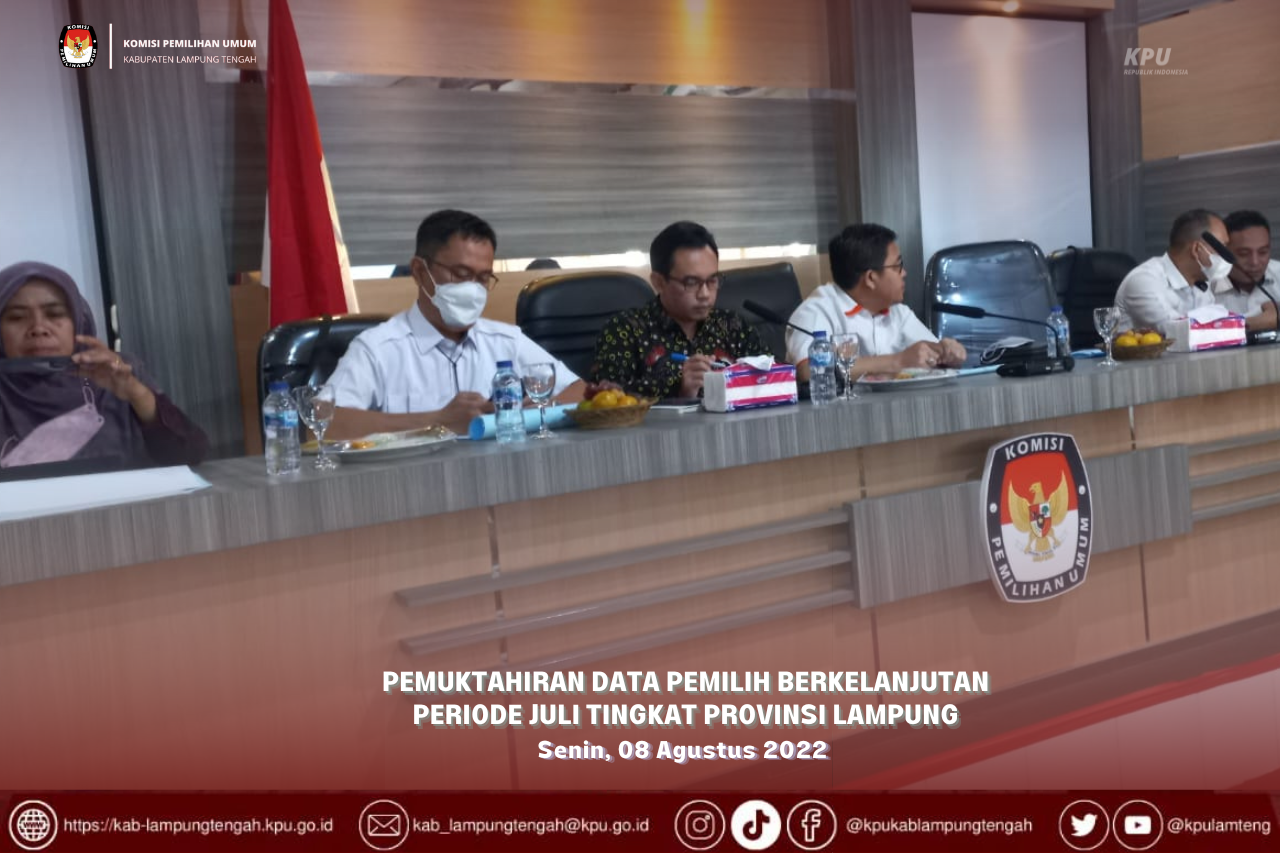 Komisi Pemilihan Umum Kabupaten Lampung Tengah pada hari Senin, 08 Agustus 2022 mengikuti Rapat Koordinasi Rekapitulasi Pemutakhiran Data Pemilih Berkelanjutan Periode bulan Juli Tingkat Provinsi Lampung.