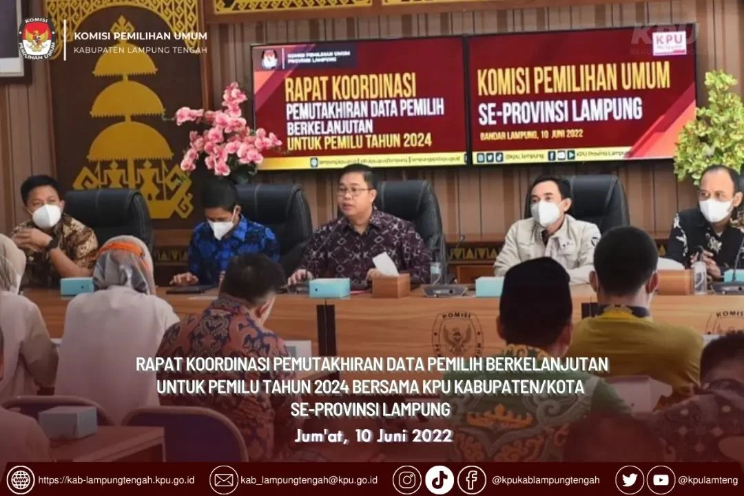 Anggota KPU Kabupaten Lampung Tengah Divisi Data dan Informasi, Ade Ariyanto didampingi Kasubbag Perencanaan Data dan Informasi, Djoko Pangestu dan Operator SiDalih, Abdul Halim menghadiri Rapat Koordinasi Pemutakhiran Data Pemilih Berkelanjutan untuk Pemilu Tahun 2024 bersama KPU Kabupaten/Kota se-Provinsi Lampung secara luring di Aula KPU Provinsi Lampung, Jumat (10/06).
