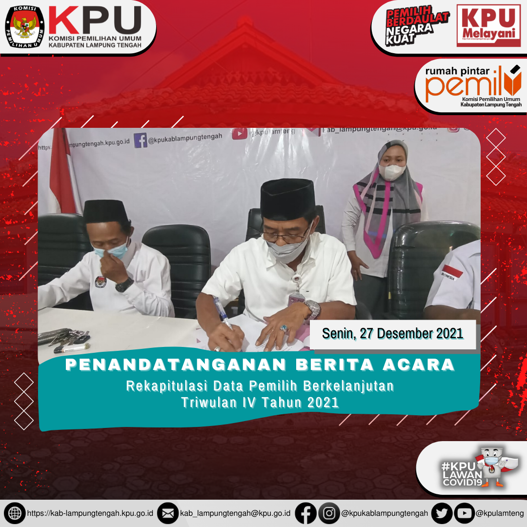 Tabik puuun... Hai #PemilihLampungTengah , Ketua KPU Kabupaten Lampung Tengah, Bapak Irawan Indra Jaya menyerahkan Berita Acara Rekapitulasi Data Pemilih Berkelanjutan untuk periode Triwulan IV tahun 2021 kepada Bawaslu Kabupaten Lampung Tengah, Dinas Kependudukan dan Catatan Sipil serta Partai Demokrat dan Partai Nasdem di Kabupaten Lampung Tengah. Rekapitulasi Data Pemilih Berkelanjutan untuk periode Triwulan IV tahun 2021 dengan jumlah pemilih sebanyak 928.362 dengan rincian Pemilih Baru 1.000, Pemilih Tidak Memenuhi Syarat 1.105 dan Perbaikan Data Pemilih 585 yang tersebar di 28 Kecamatan dan 311 Desa/Kelurahan. Ikuti informasi terupdate KPU Kabupaten Lampung Tengah dengan follow dan like kami di: Website: https://kab-lampungtengah.kpu.go.id Email : kab_lampungtengah@kpu.go.id Fanpage Fb : @kpukablampungtengah Instagram : @kpukablampungtengah Twitter : @kpulamteng Youtube : @kpulamteng #KPULamTeng #KPULampung #KPURI #KPUMelayani #LampungTengah #KPULawanCovid19