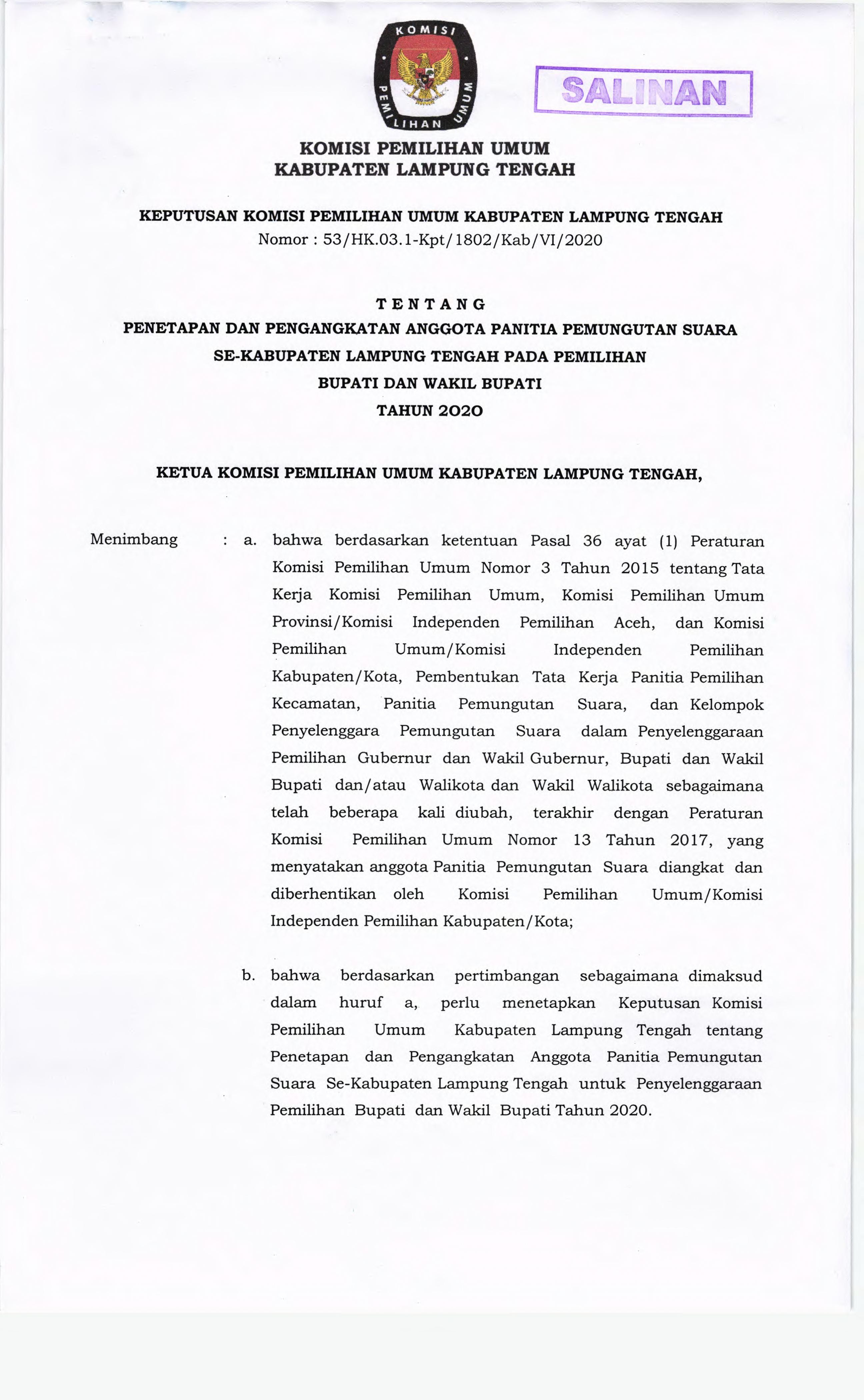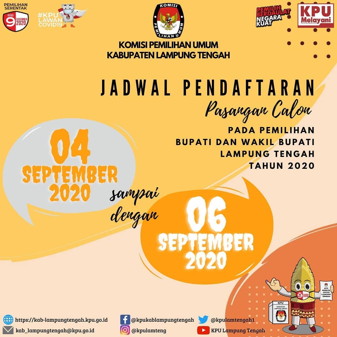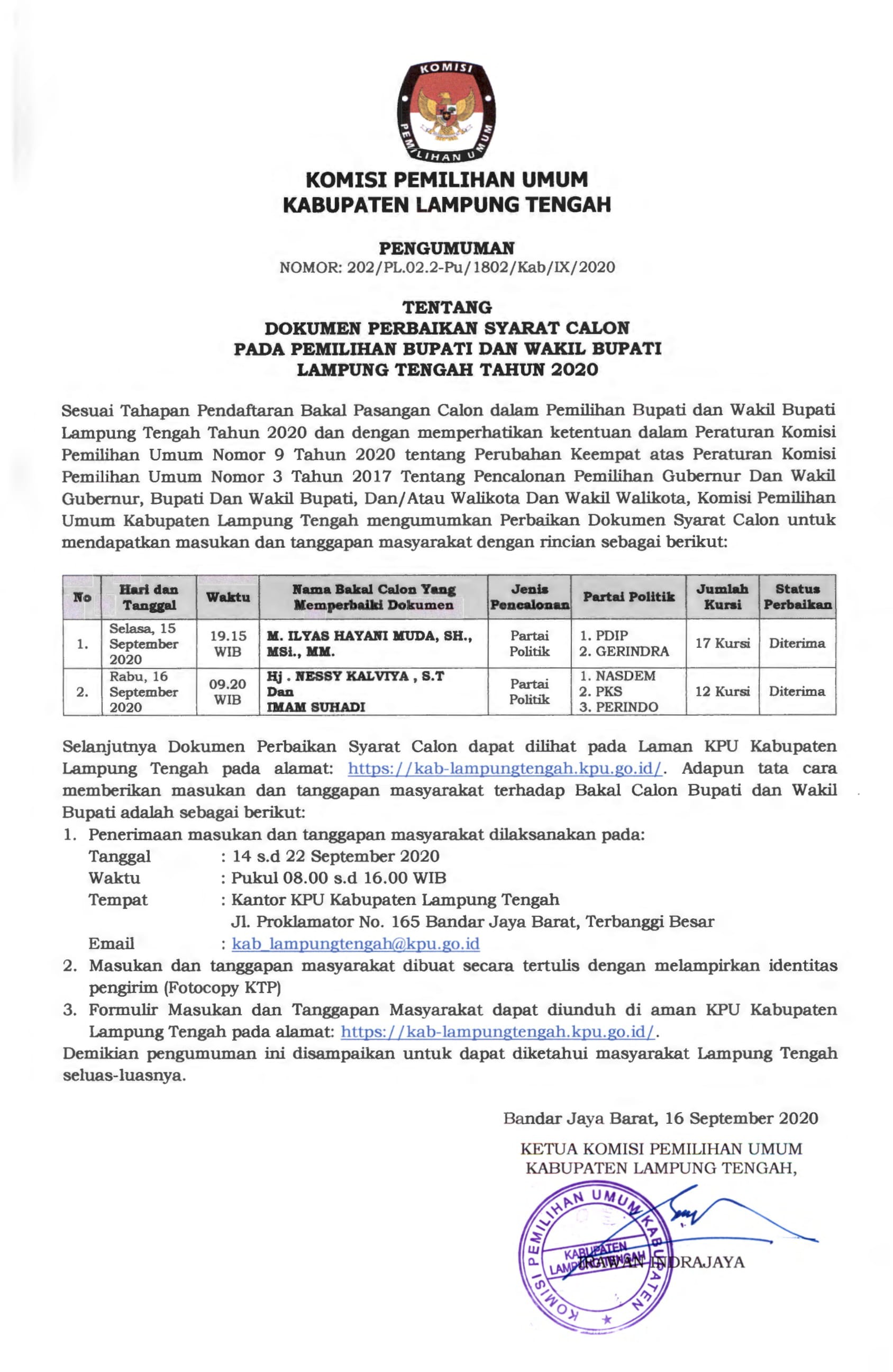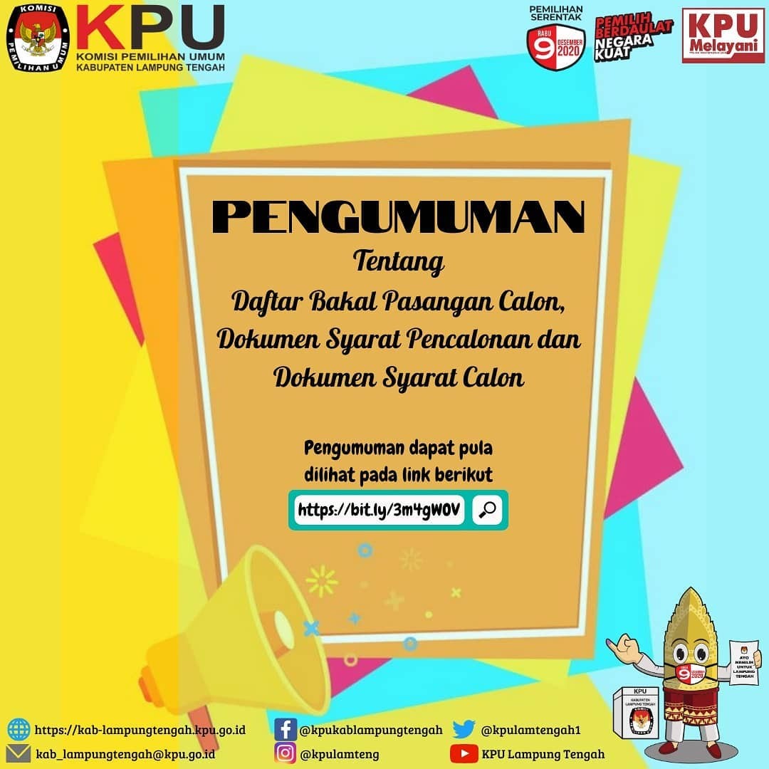 Komisi Pemilihan Umum Kabupaten Lampung Tengah mengumuman Daftar Bakal Pasangan Calon, Dokumen Syarat Pencalonan dan Dokumen Syarat Calon pada Pemilihan Bupati dan Wakil Bupati Lampung Tengah Tahun 2020 untuk mendapatkan masukan dan tanggapan masyarakat terhadap bakal calon.