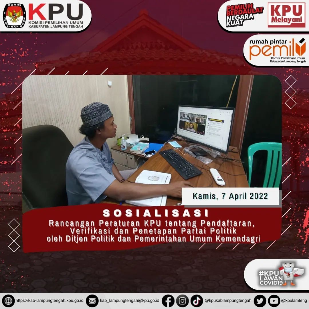 KPU Kabupaten Lampung Tengah mengikuti Sosialisasi Rancangan Peraturan KPU tentang Pendaftaran, Verifikasi dan Penetapan Partai Politik Peserta Pemilu yang diselenggarakan oleh Ditjen Politik dan Pemerintahan Umum Kemendagri, Kamis (07/04).