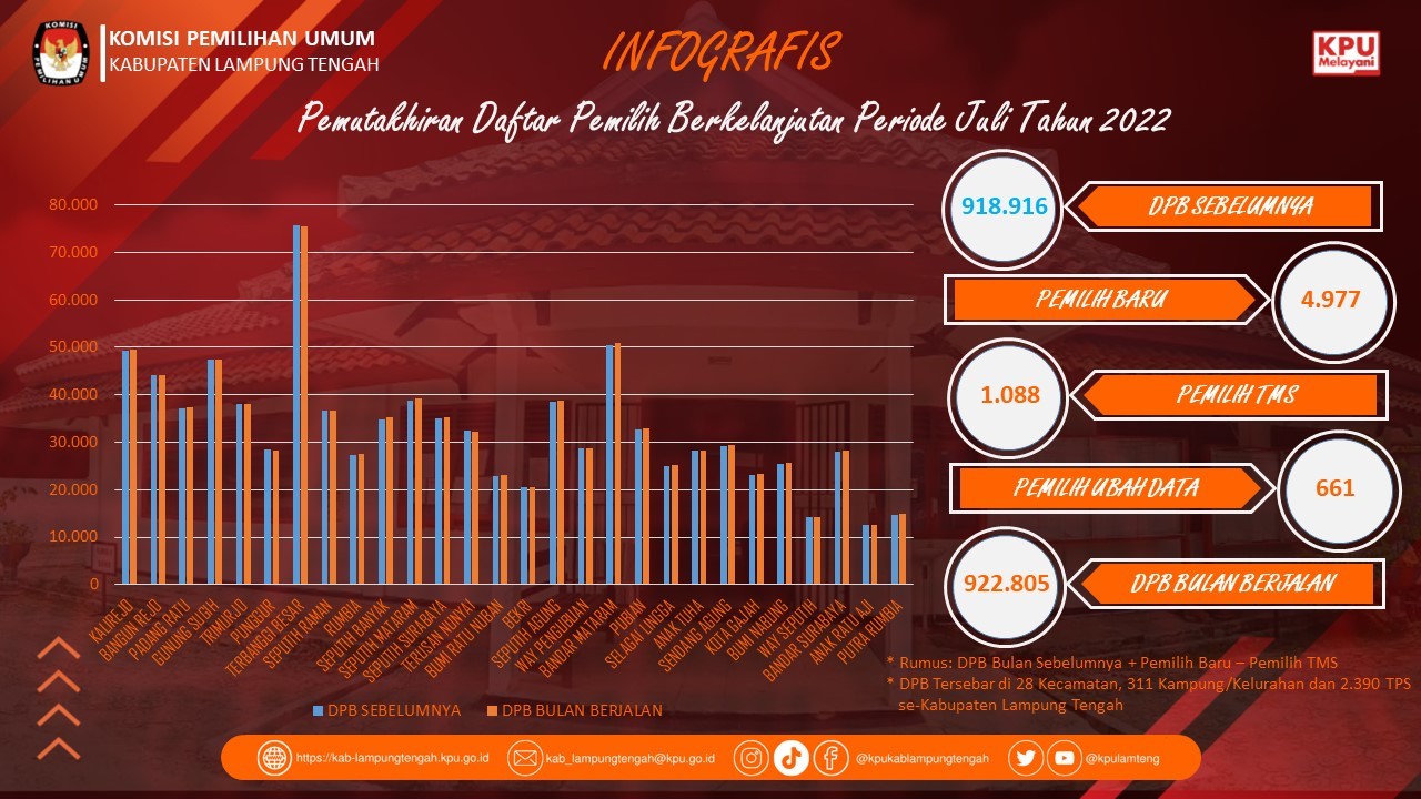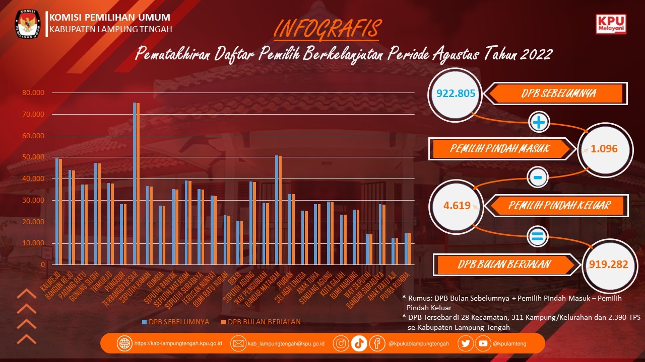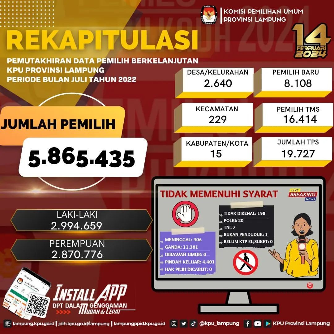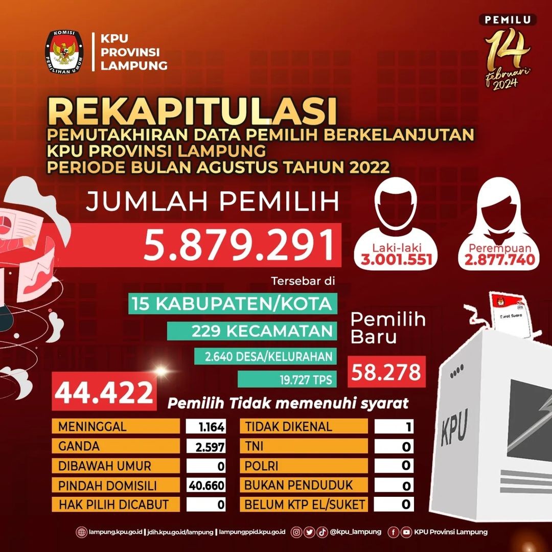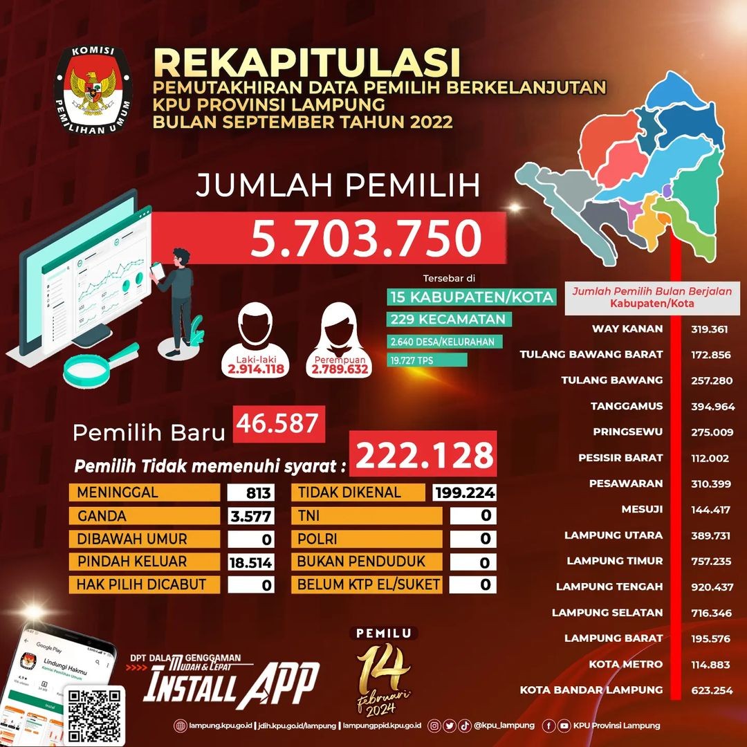 Hasil rekapitulasi DPB Periode bulan September tahun 2022 tingkat Provinsi Lampung berjumlah 5.703.750 pemilih dengan pemilih laki-laki 2.914.118 dan pemilih perempuan 2.789.632 dari jumlah DPB sebelumnya periode Agustus 2022 berjumlah 5.879.291 pemilih yang tersebar di 15 kabupaten/kota, 229 kecamatan, 2.640 desa/kelurahan, 19.777 TPS.