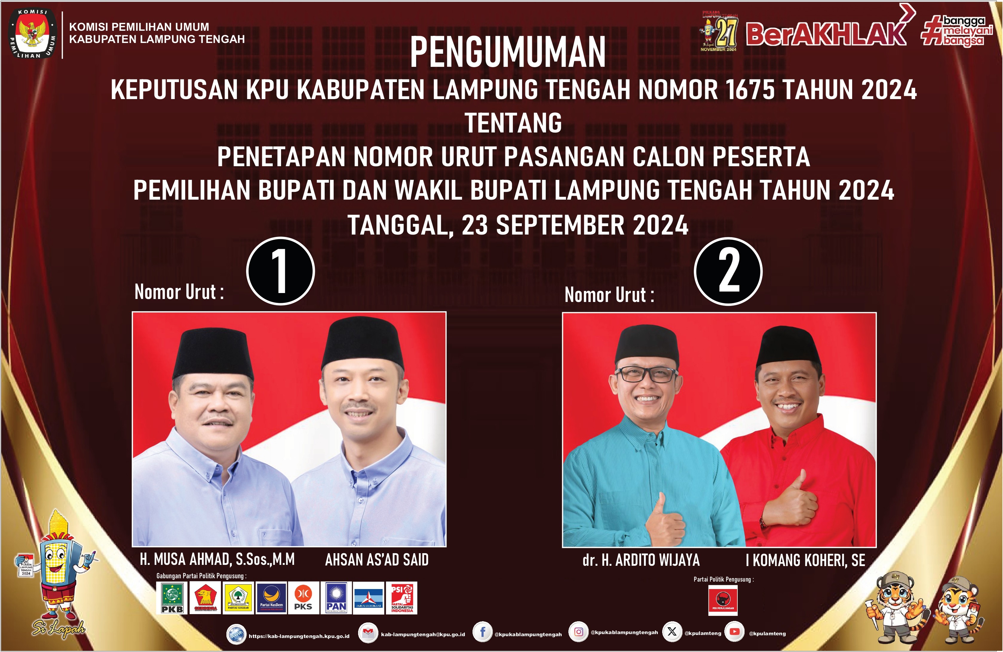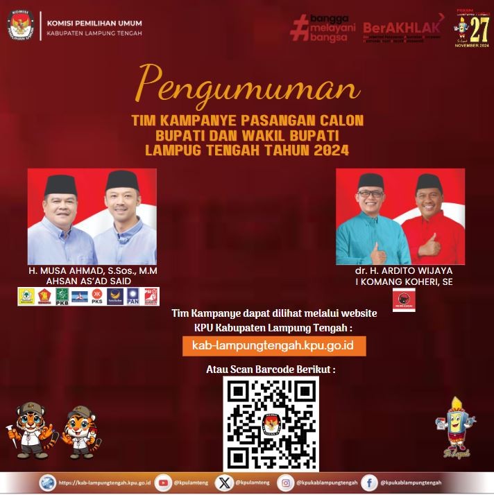 #TemanPemilih, Hasil Rapat Pleno dtuangkan dalam Keputusan KPU Kabupaten Lampung Tengah Nomor 1675 Tahun 2024 Tentang Penetapan Nomor Urut Pasangan Calon Peserta Pemilihan Bupati dan Wakil Bupati Lampung Tengah Tahun 2024 Tanggal 23 September 2024 dengan menetapkan Pasangan Calon Bupati dan Wakil Bupati Lampung Tengah :