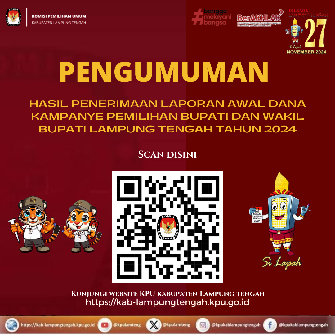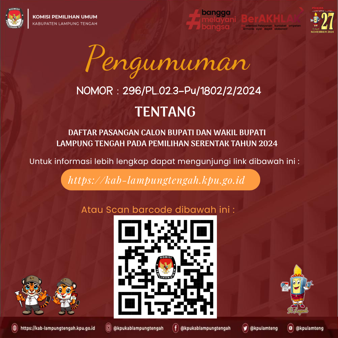 Berikut Salinan Keputusan KPU Kabupaten Lampung Tengah Nomor 1675 Tahun 2024 Tentang Penetapan Nomor Urut Pasangan Calon Peserta Pemilihan Bupati dan Wakil Bupati Lampung Tengah Tahun 2024 Klik Disini