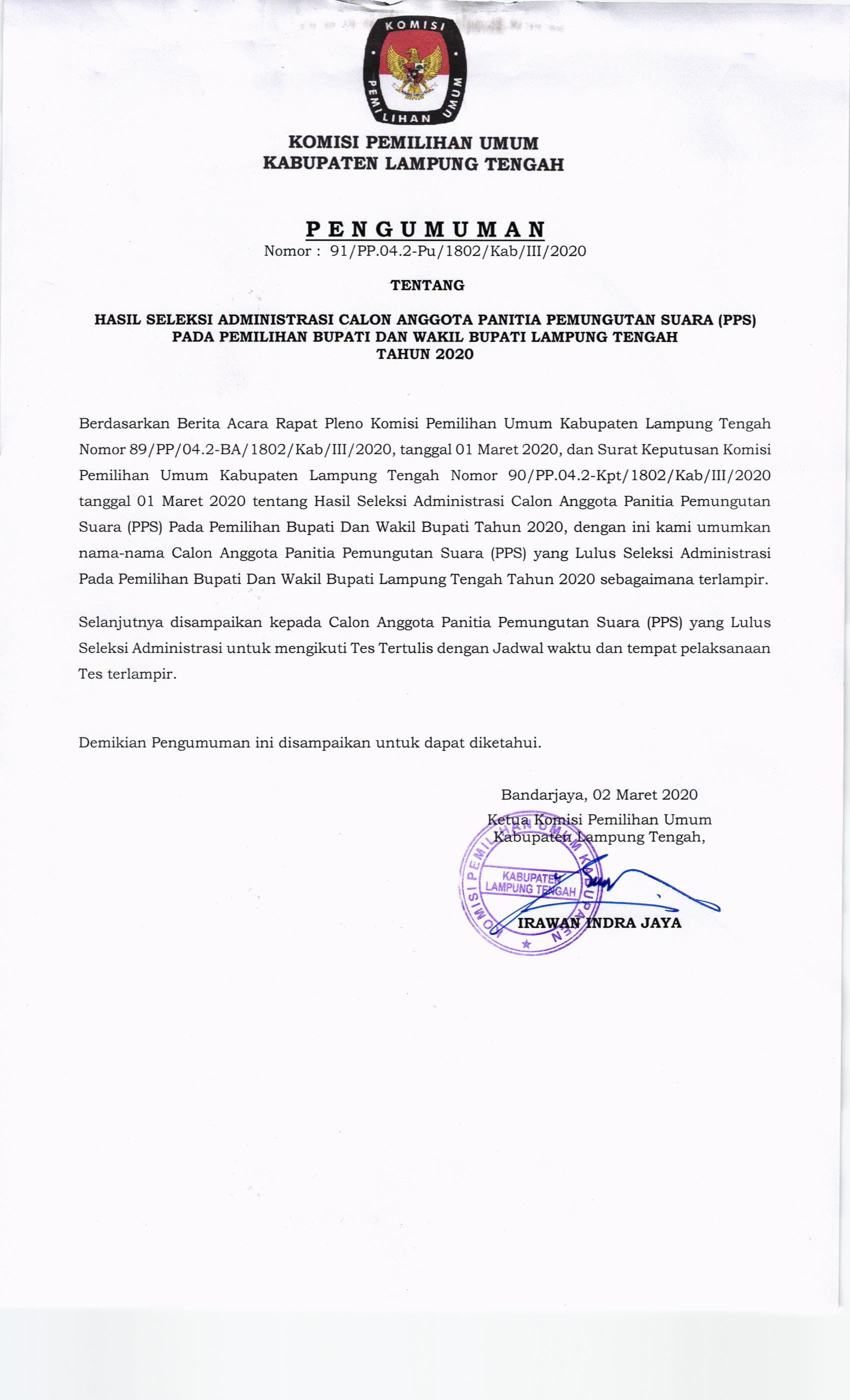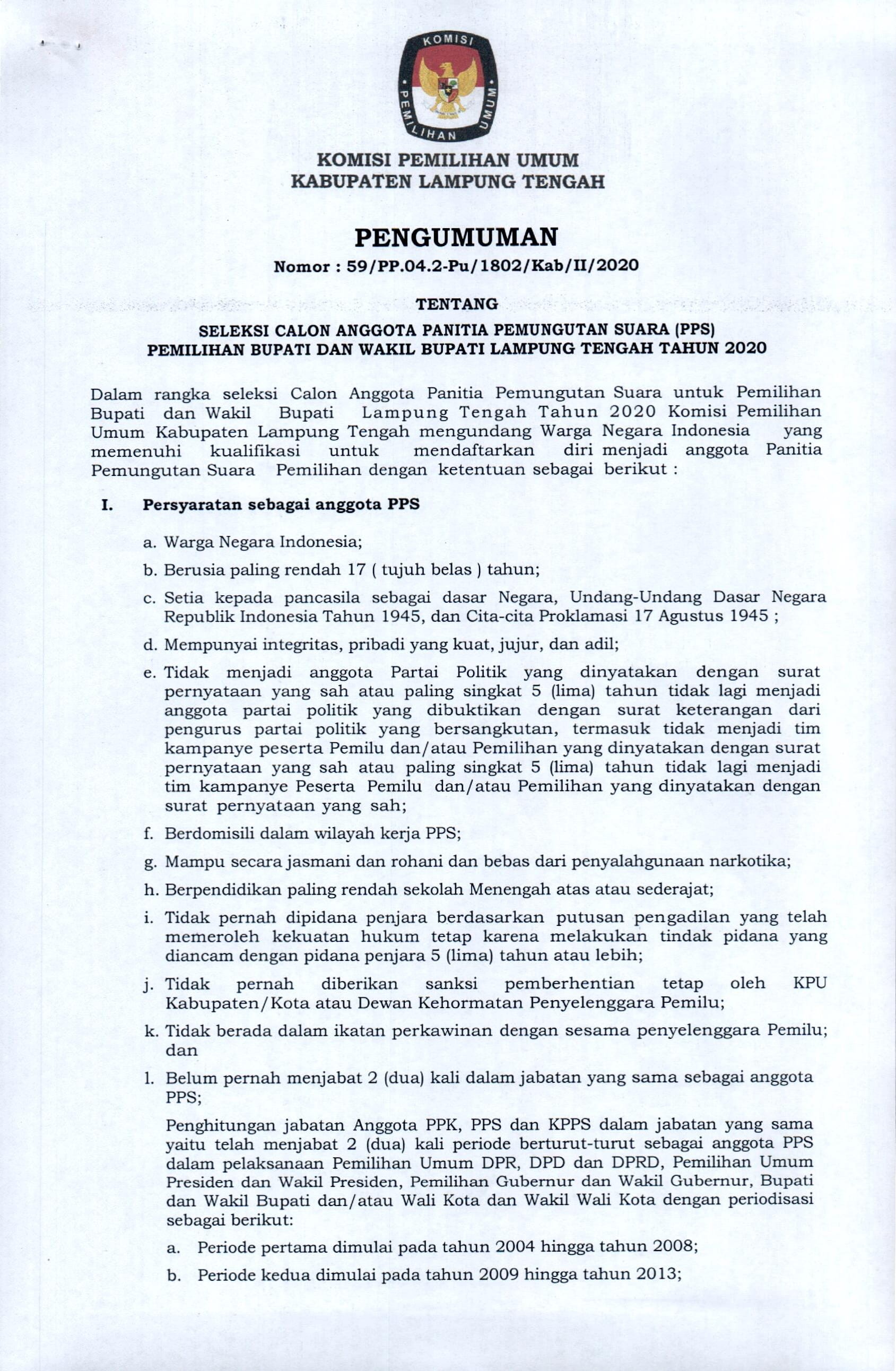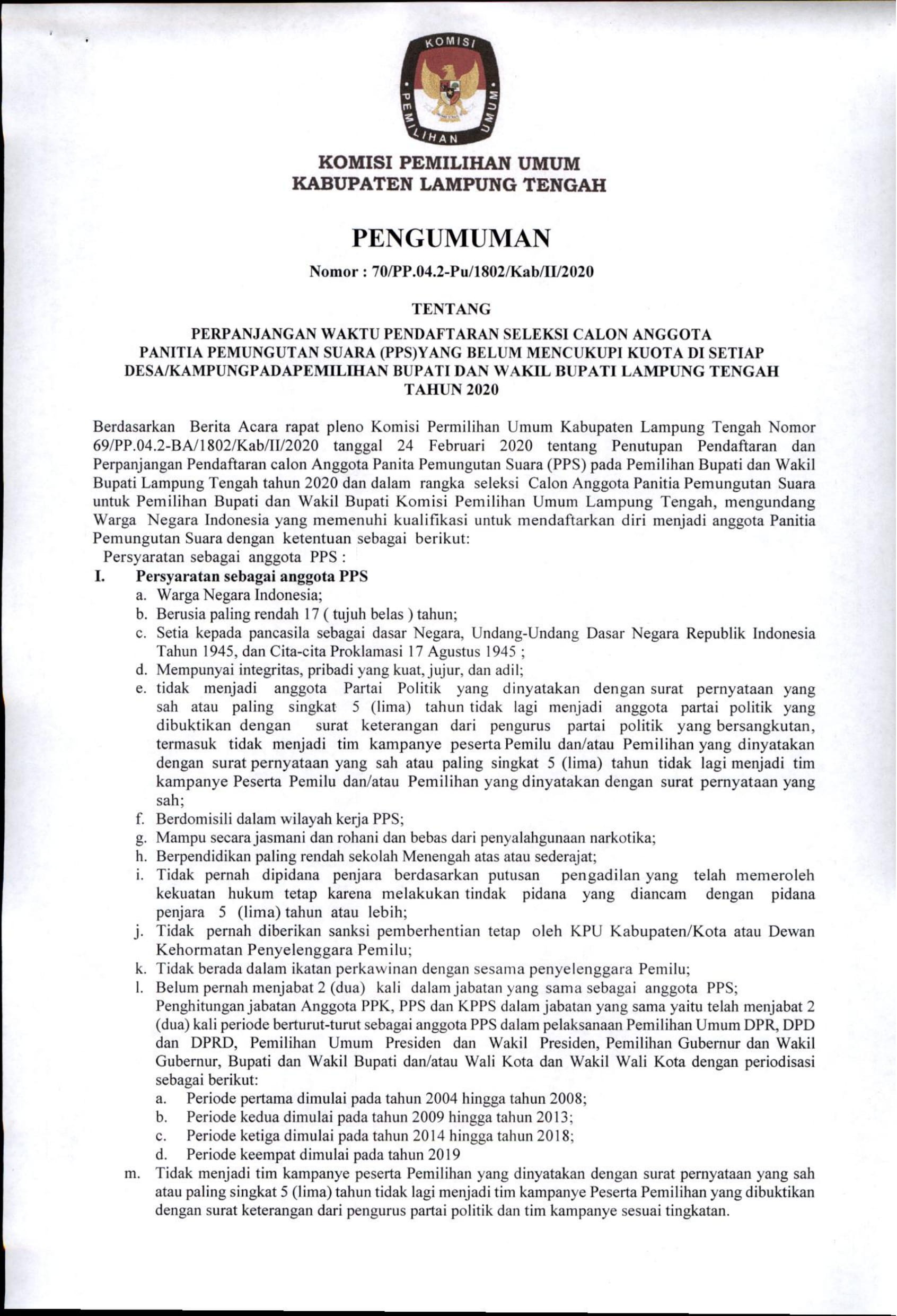 Pengumuman Perpanjangan Waktu Pendaftaran Calon Anggota Panitia Pemungutan Suara (PPS) Kabupaten Lampung Tengah Dalam Pemilihan Dalam Pemilihan Bupati Dan Wakil Bupati Tahun 2020