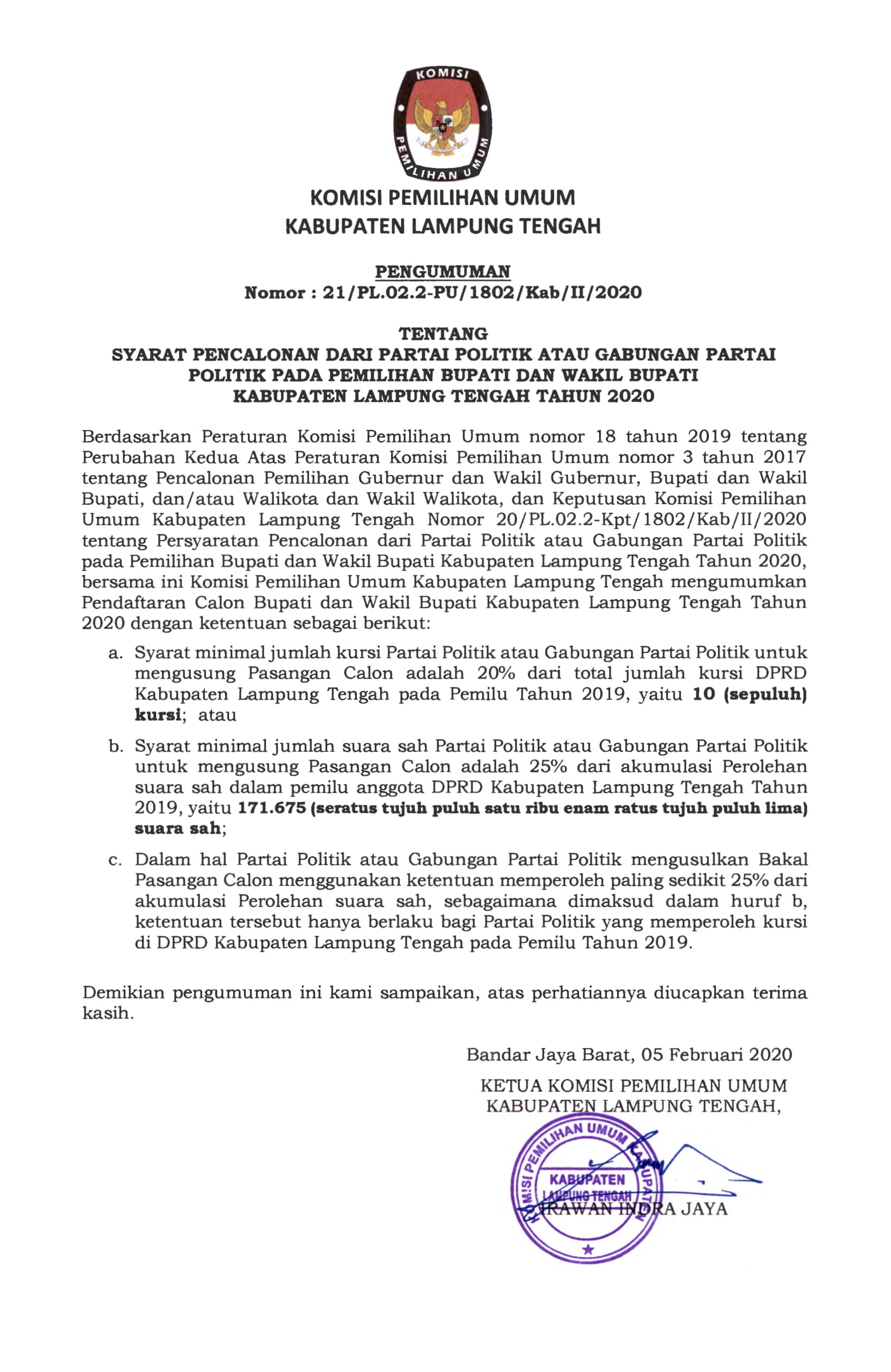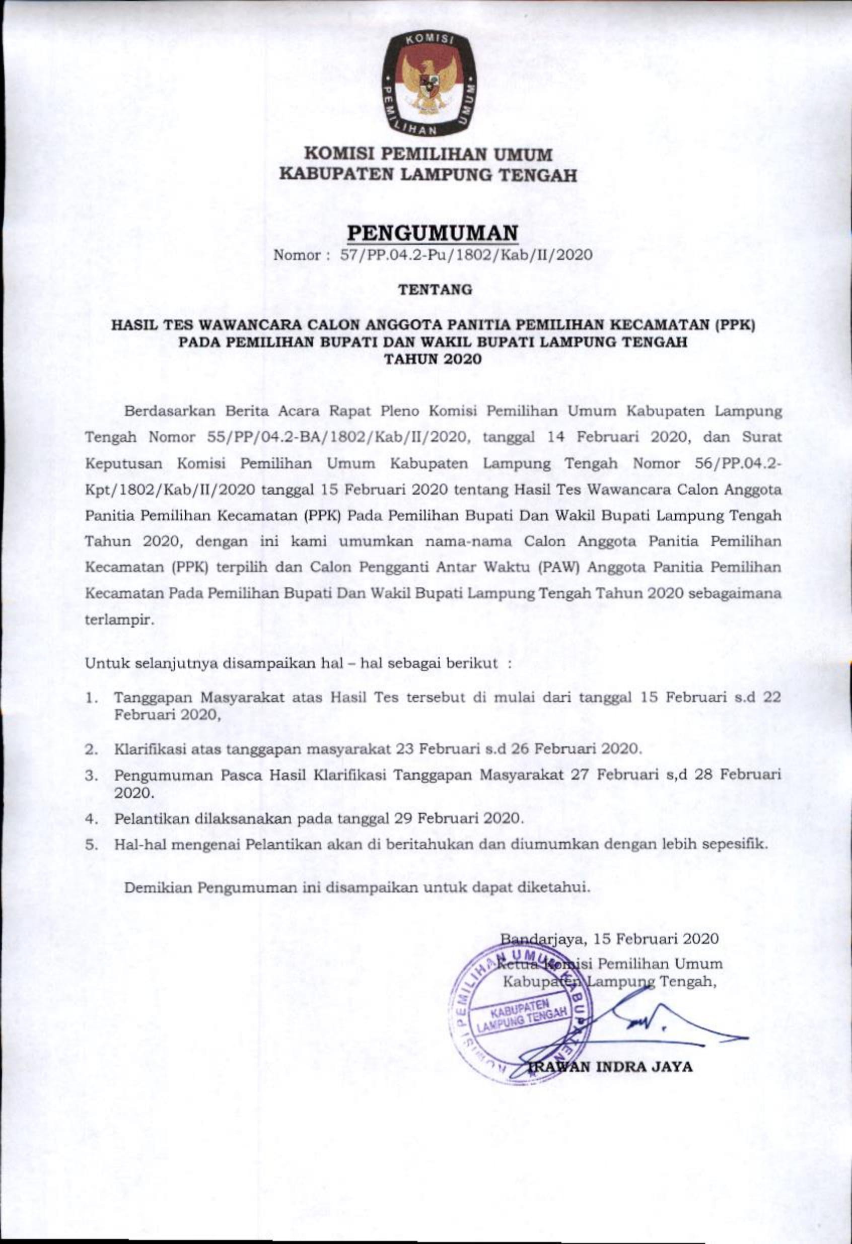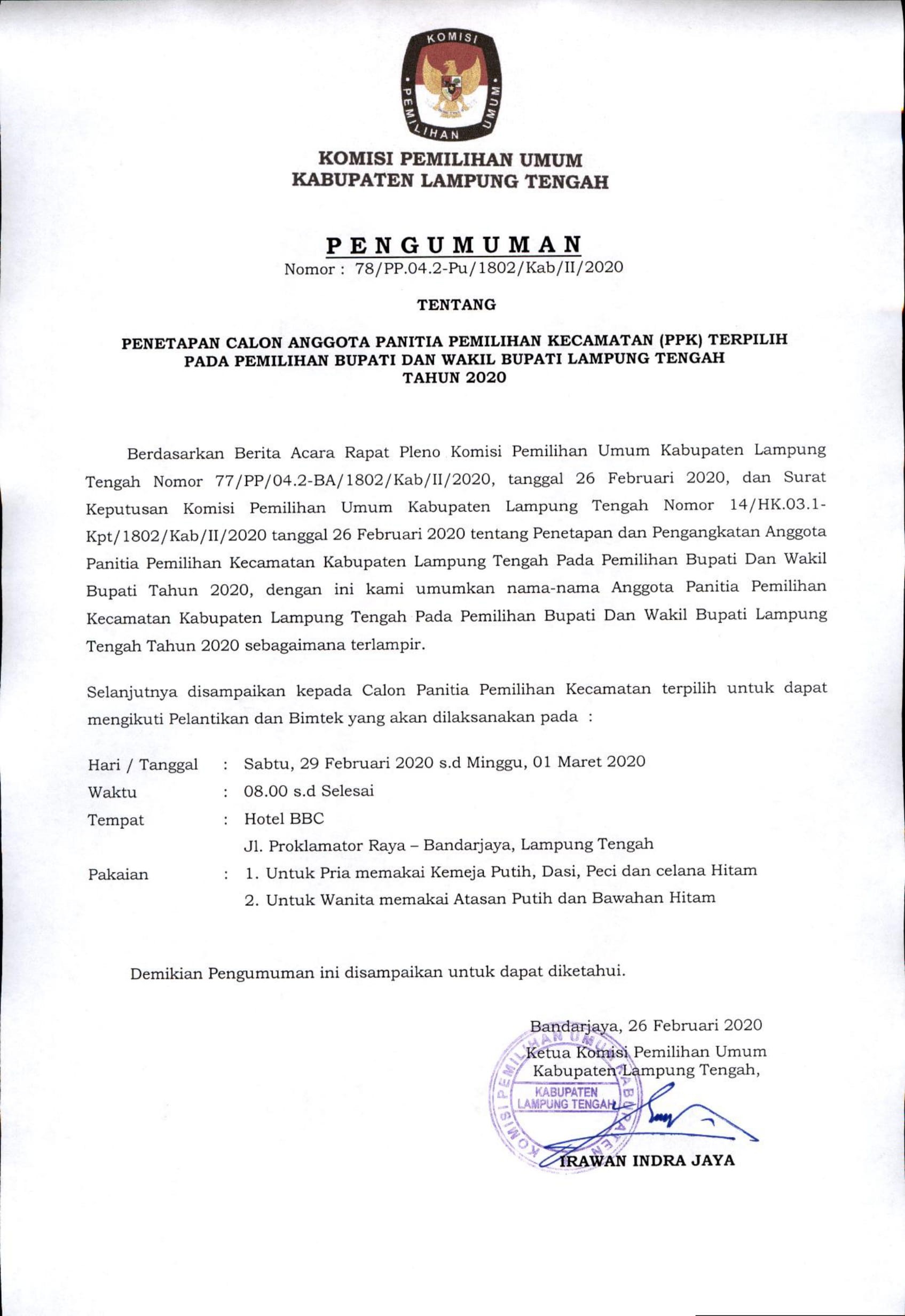 Pengumuman Perpanjangan Waktu Pendaftaran Calon Anggota Panitia Pemungutan Suara (PPS) Kabupaten Lampung Tengah Dalam Pemilihan Dalam Pemilihan Bupati Dan Wakil Bupati Tahun 2020