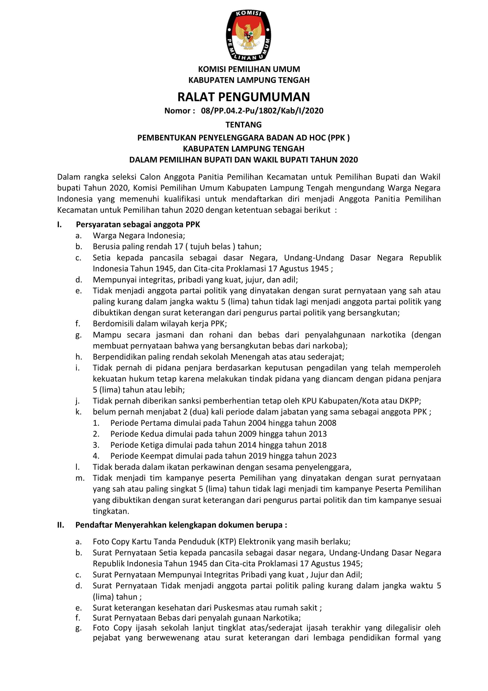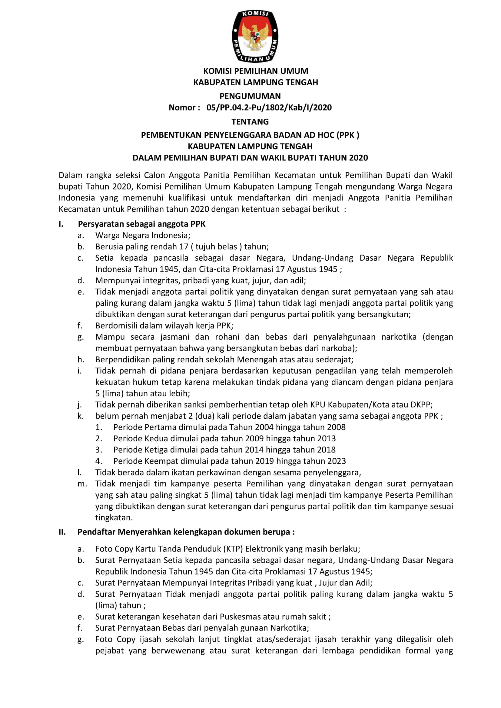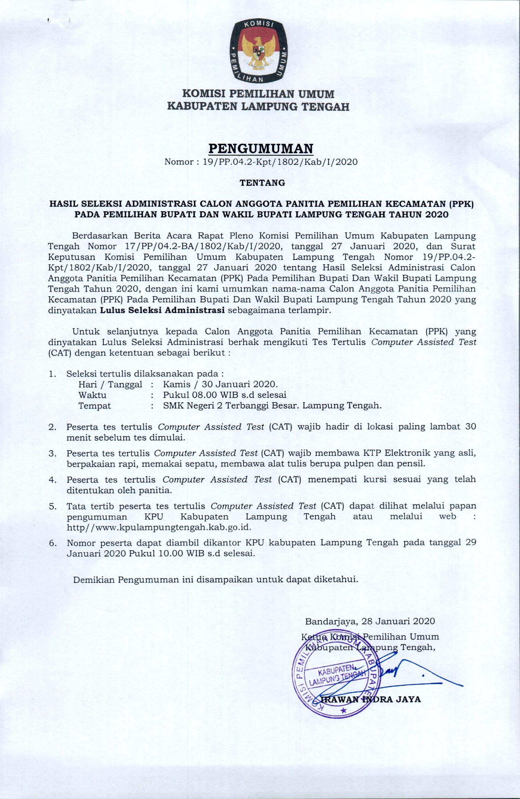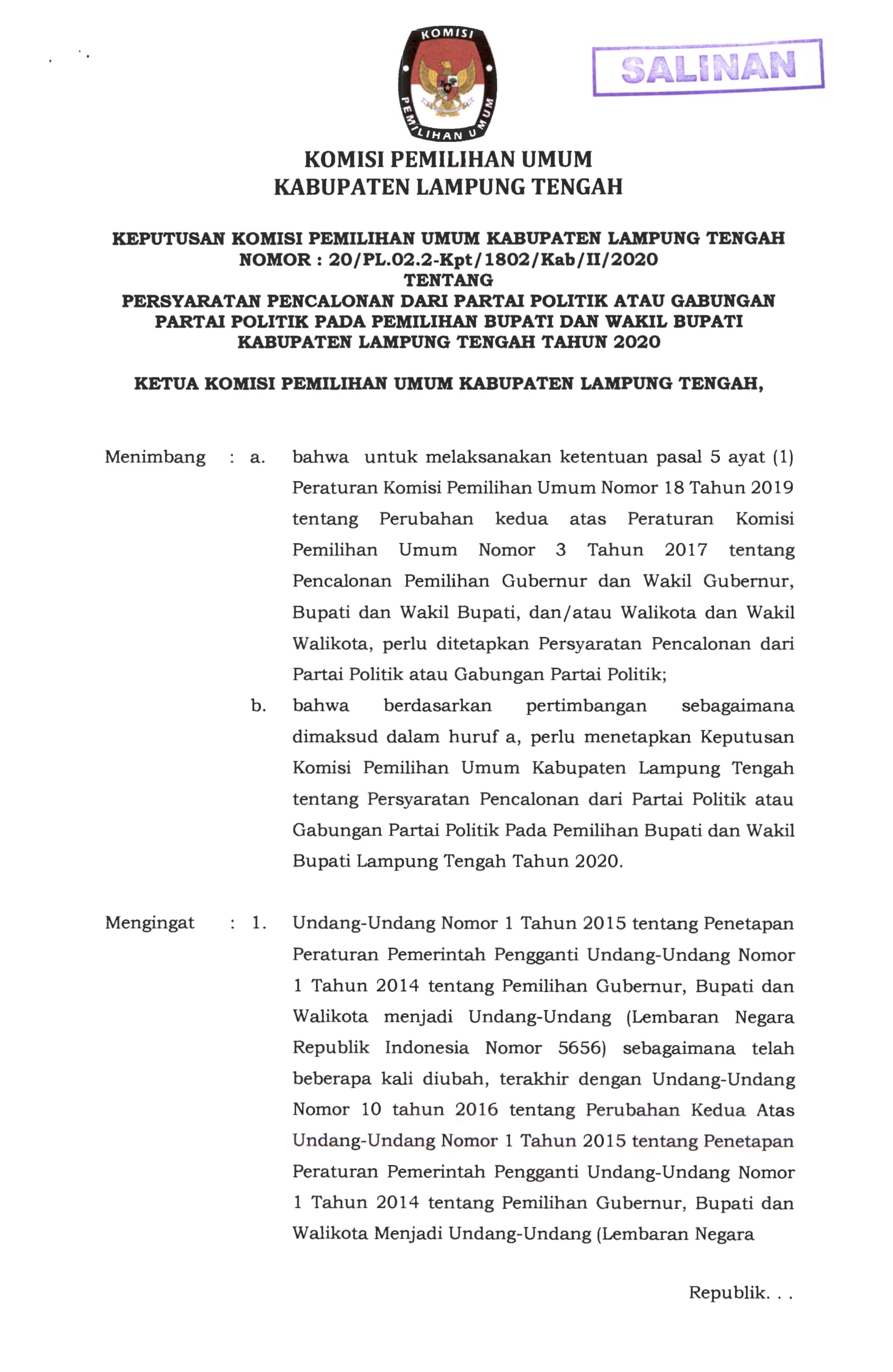 Berdasarkan Pengumuman Nomor: 185/PP.06.2-PU/1802/Kab/XII/2019 Tentang Pemenang Lomba Cipta Jingle dan Maskot Pada Pemilihan Bupati dan Wakil Bupati Lampung Tengah Tahun 2020.