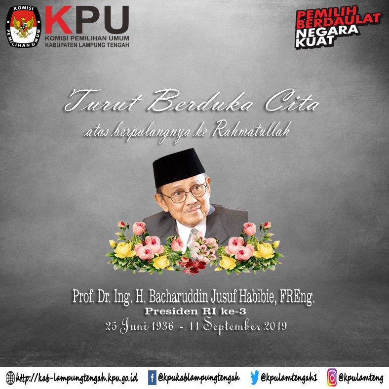 Keluarga Besar KPU Kabupaten Lampung Tengah mengucapkan turut berduka cita atas berpulangnya Bapak Prof. Dr. Ing. H. Bacharuddin Jusuf Habibie, FREng ke Rahmatullah.