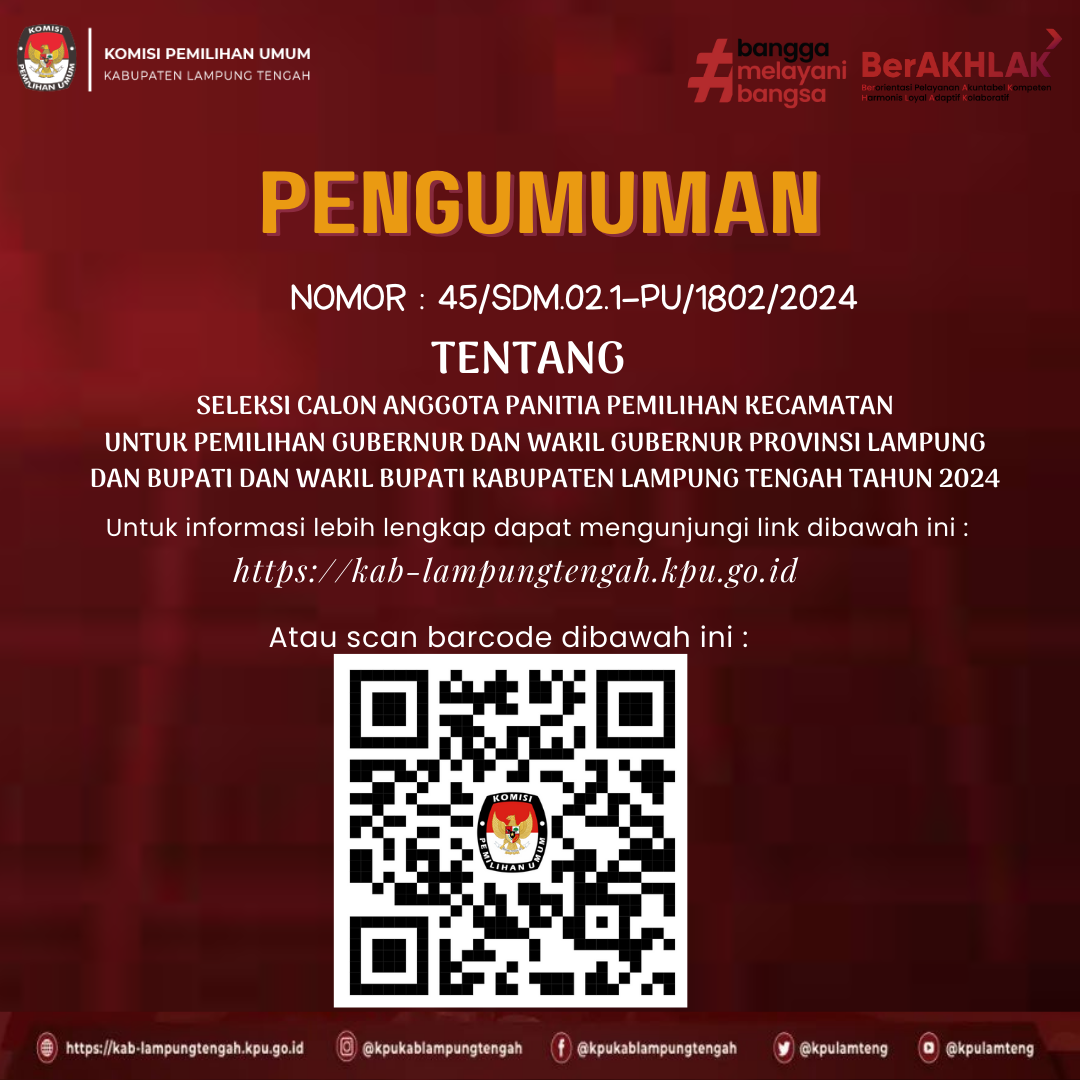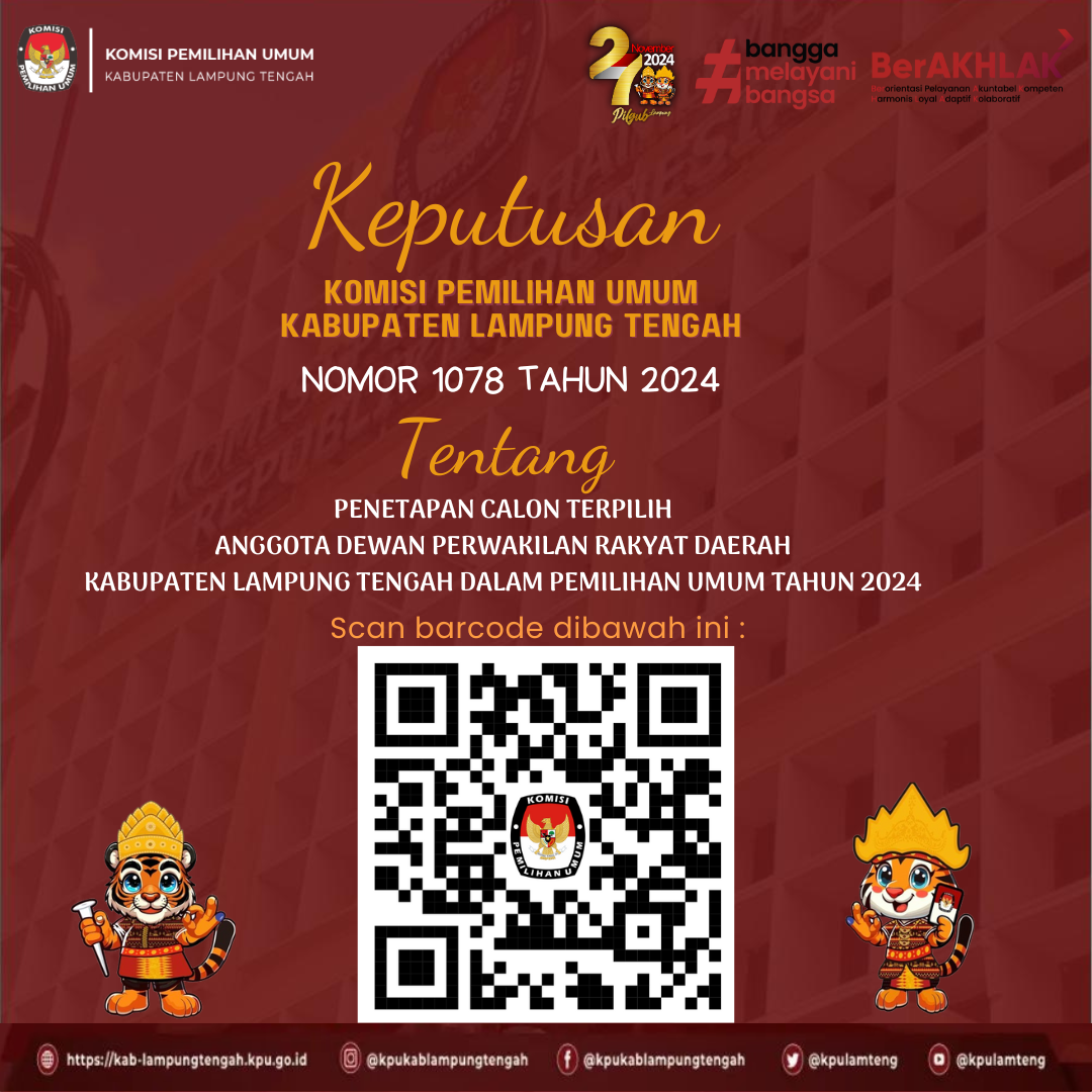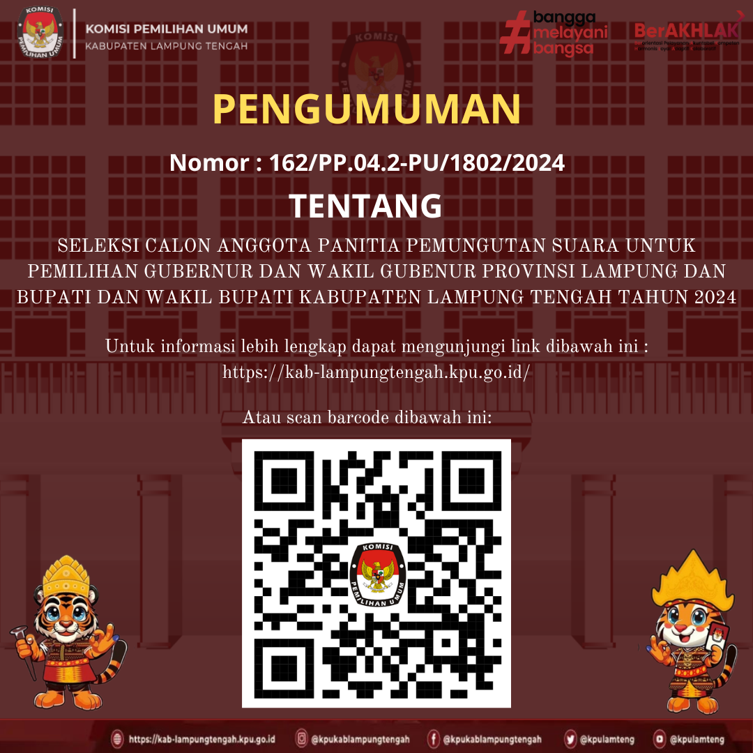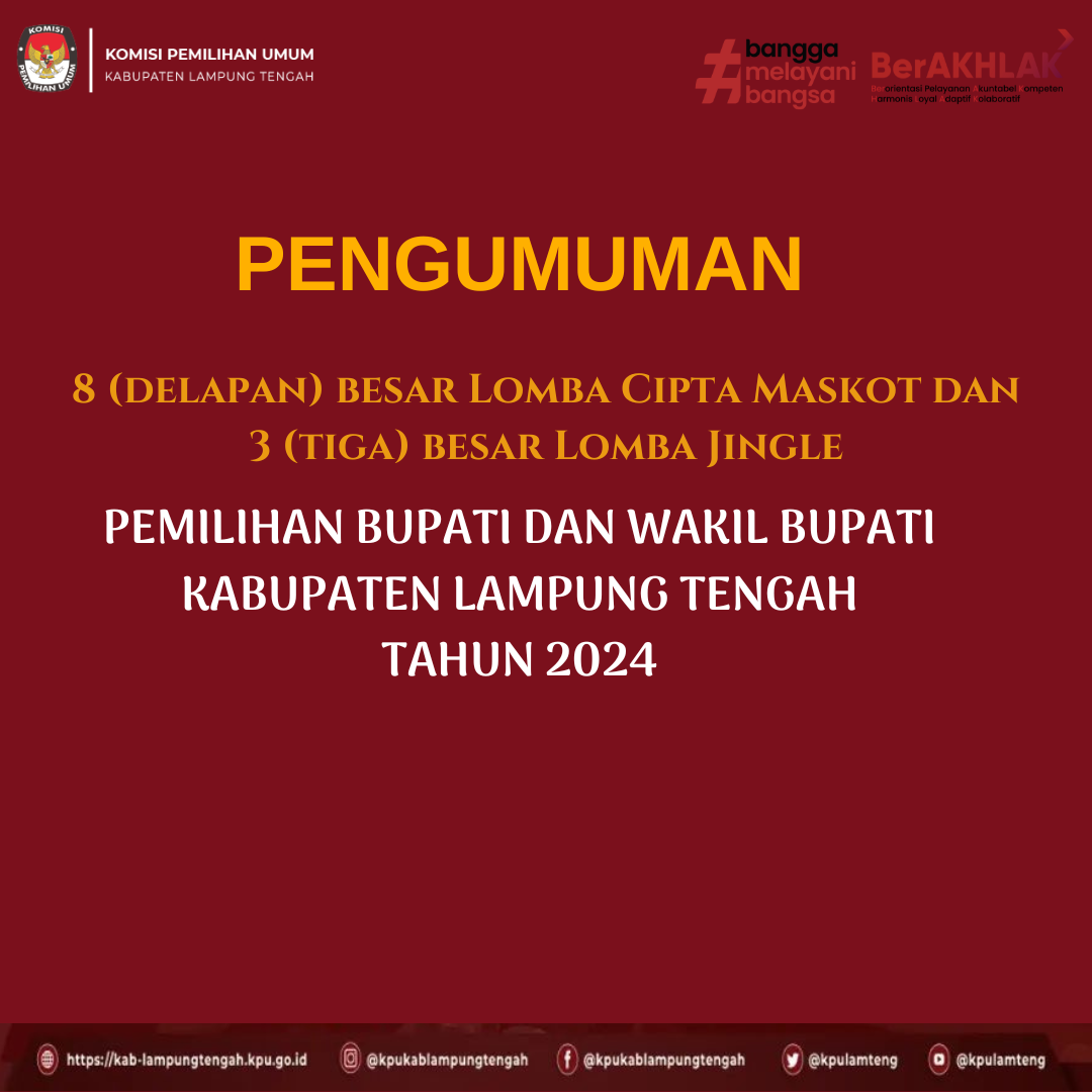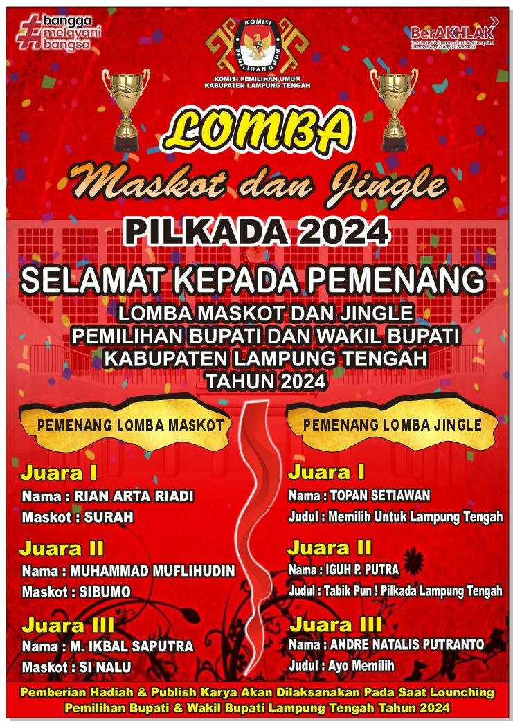#TemanPemilih, Berikut adalah Pemenang dari Lomba Cipta Maskot dan Jingle Pemilihan Bupati dan Wakil Bupati Kabupaten Lampung Tengah Tahun 2024. Selamat kepada para pemenang Lomba Cipta Maskot dan Jingle Pemilihan Bupati dan Wakil Bupati Kabupaten Lampung Tengah Tahun 2024.