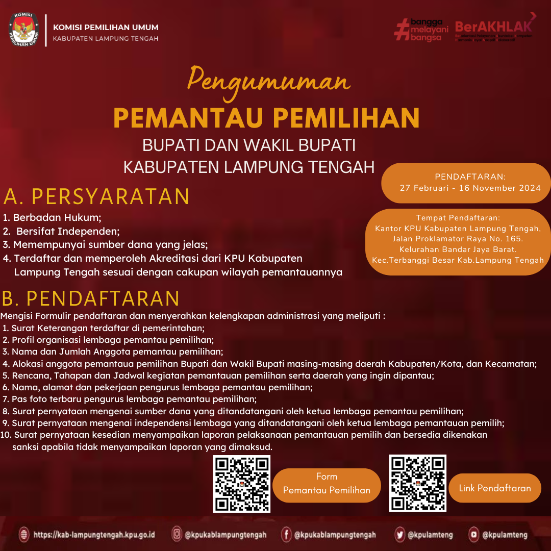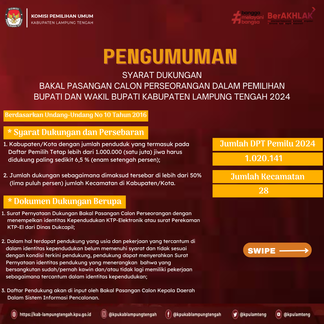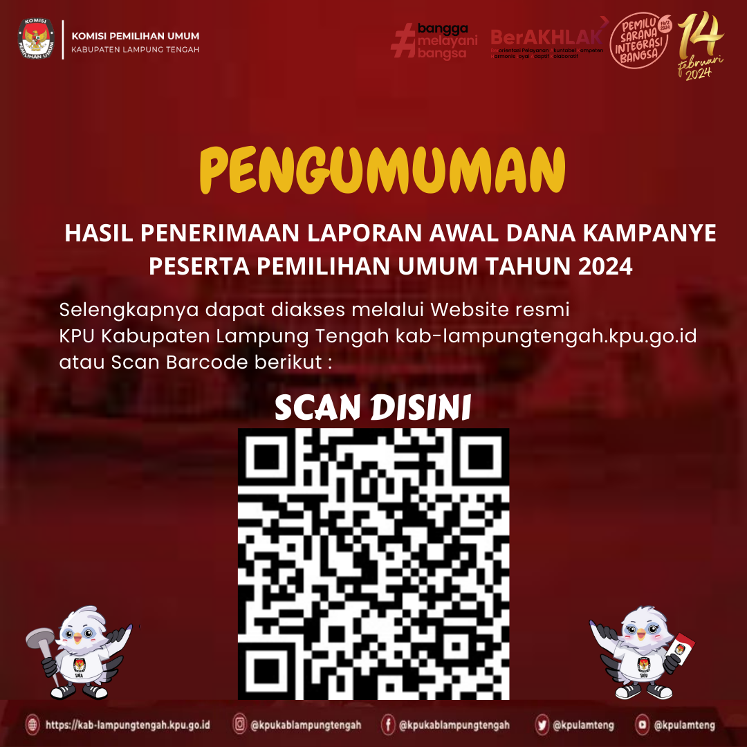 #TemanPemilih, Berikut kami sampaikan Pengumuman Rekapitulasi Hasil Penghitungan Perolehan Suara Tingkat Kabupaten Lampung Tengah Pada Pemilihan Umum 2024 untuk Pemilihan Presiden dan Wakil Presiden, Dewan Perwakilan Rakyat Republik Indonesia, Dewan Perwakilah Daerah Republik Indonesia, Dewan Perwakilan Rakyat Daerah Provinsi Lampung, dan Dewan Perwakilan Rakyat Daerah Kabupaten Lampung Tengah.